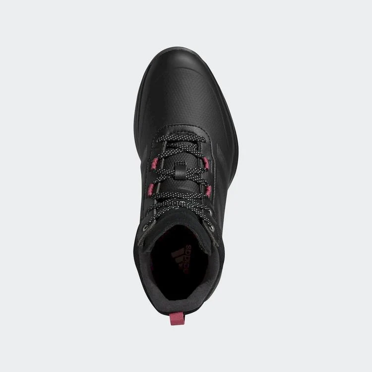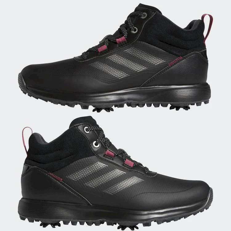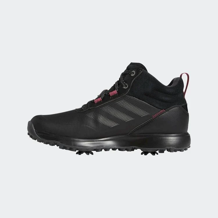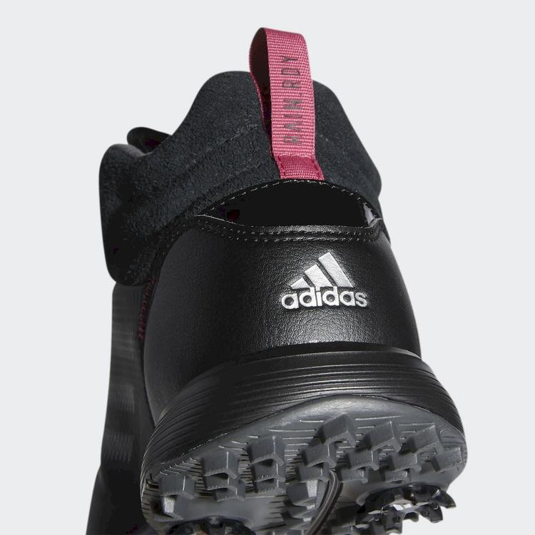 Gardez vous au chaud et au sec ! Cette botte de golf pour femme , impermeable, vous offre tout le confort des souliers Adidas pour jouer au golf tout l’automne sans avoir froid! Caractéristiques Botte de golf Crampons Noir – détails rose Doublée