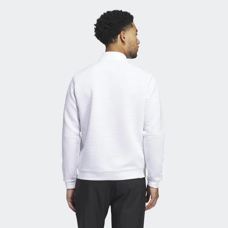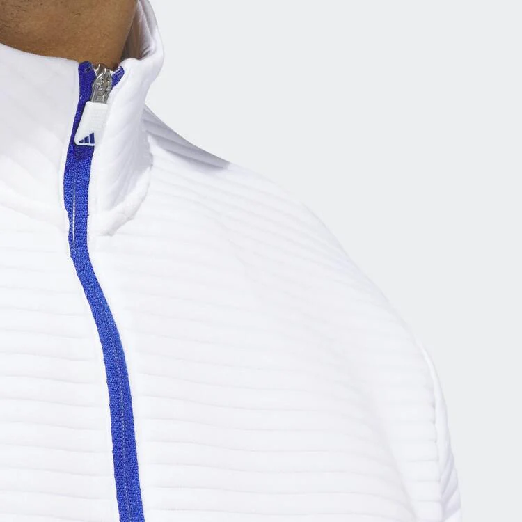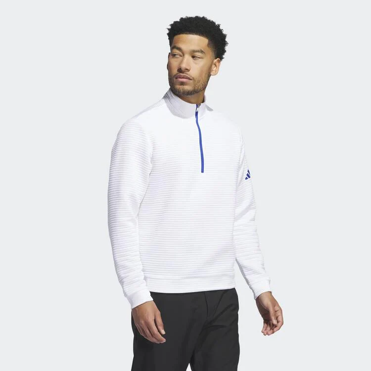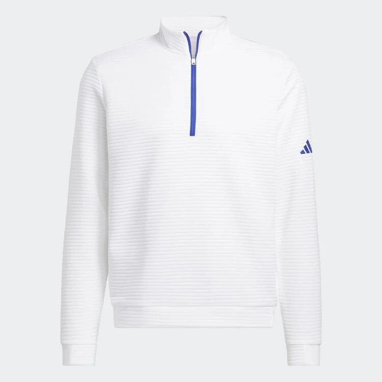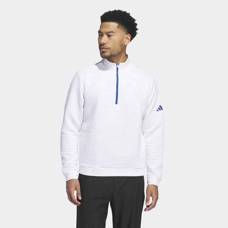 Prenez le départ en toute confiance par temps frais avec le chandail 1/4 zip Ultimate365 pour hommes d’Adidas. Ce sweat-shirt de golf vous garde au chaud sans vous alourdir grâce à son jacquard texturé. Les bords-côtes favorisent le mouvement, tandis que l’enduction déperlante évacue la transpiration pour vous garder au sec sous une averse légère. Le quart de zip bleu royal vous permet de laisser l’air circuler si besoin.