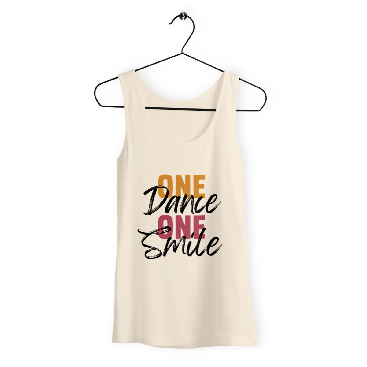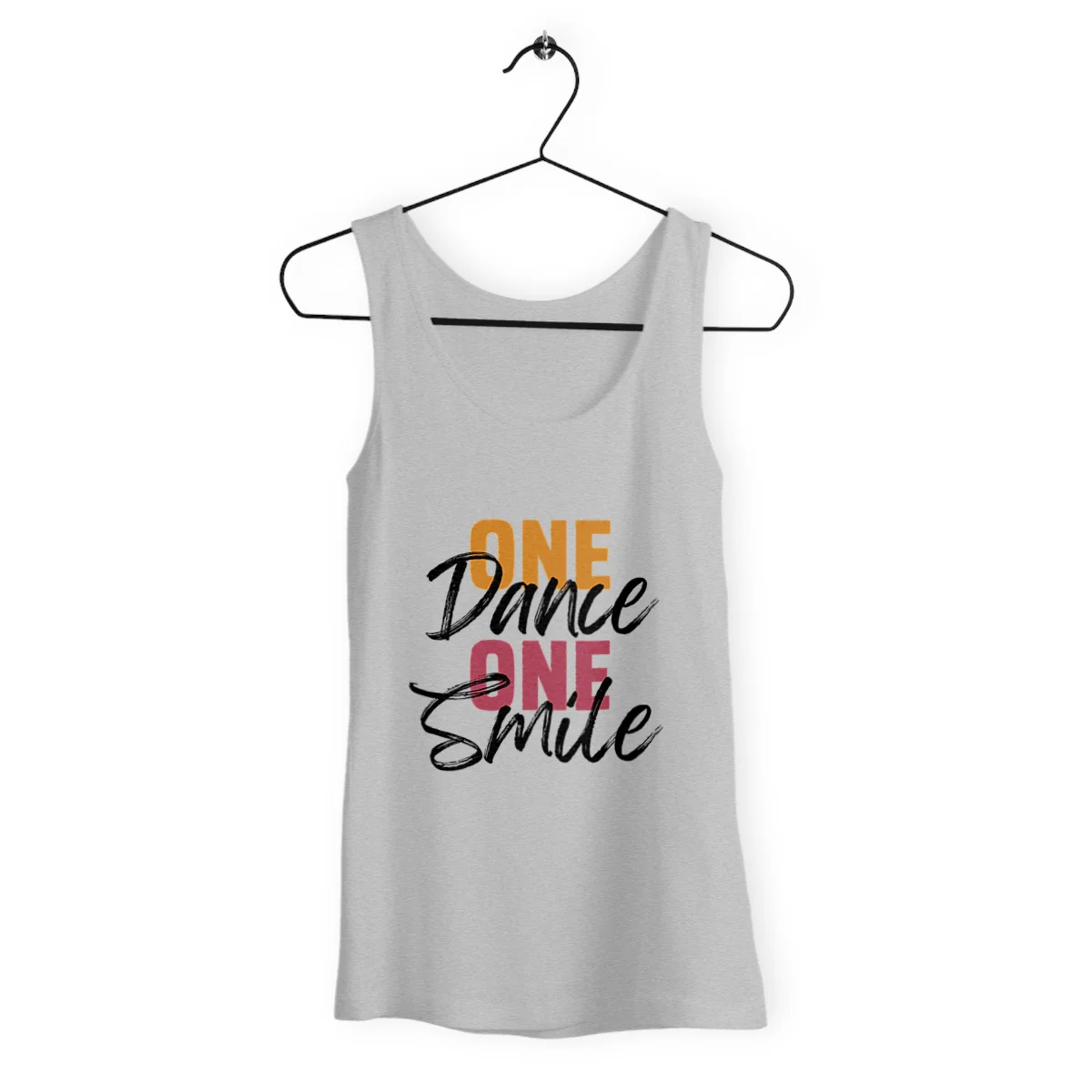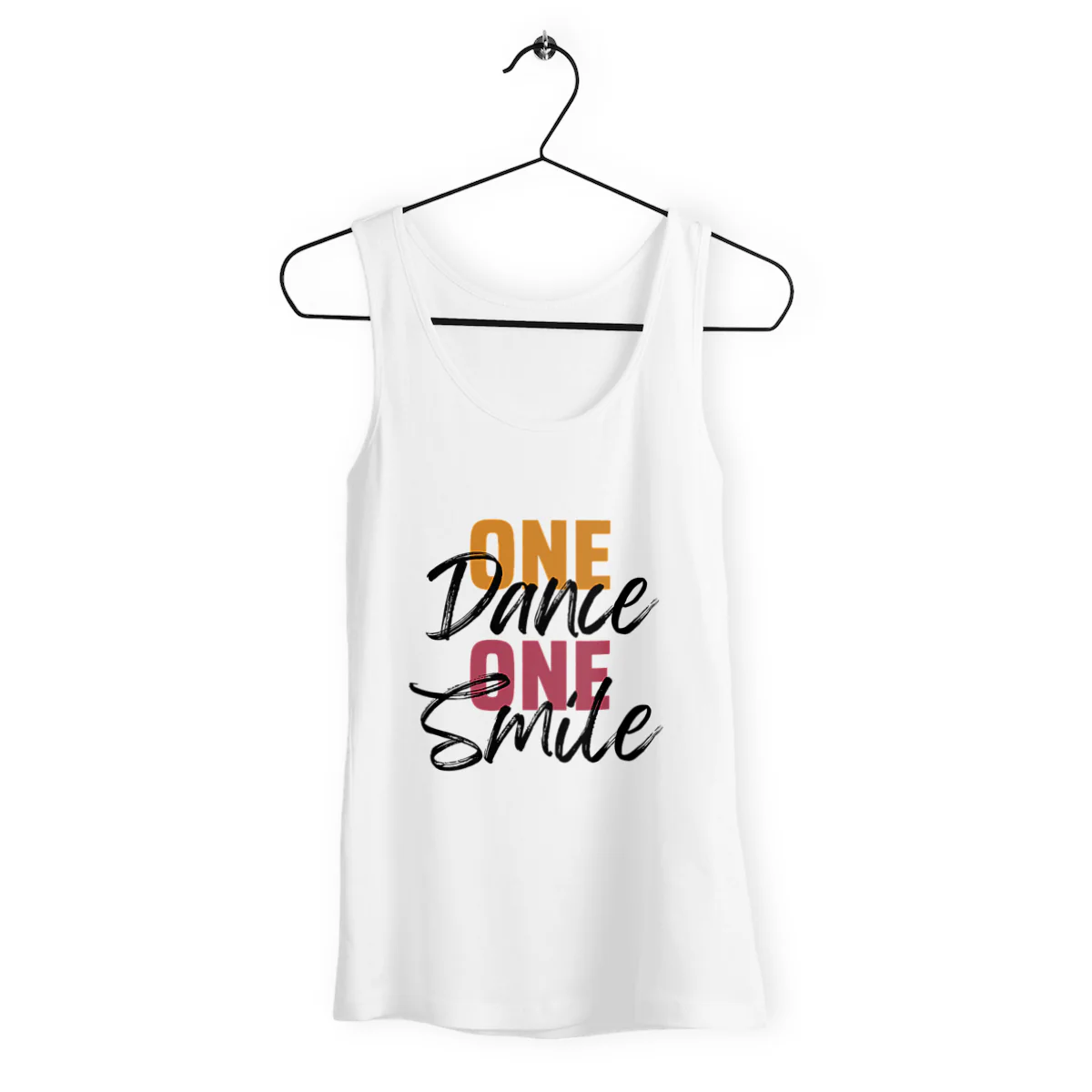 Profitez du débardeur ample pour femme « Smile » avec son message positif pour un confort optimal. Idéal pour vos cours de danse, ce haut vous donnera une tenue parfaite pour vous concentrer sur votre passion en toute tranquillité. N’oubliez pas de sourire en portant ce débardeur !