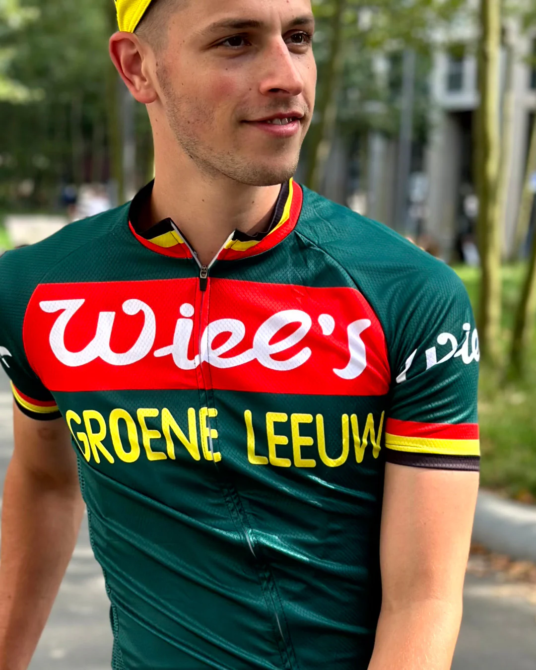 Réplique particulièrement belle du maillot cycliste historique du Wiel’s Groene Leeuw. Cette équipe cycliste belge a été fondée en 1945 par le fabricant belge de vélos Groene Leeuw. En 1960, le brasseur de bière belge Wielemans-Ceuppens de Bruxelles est devenu un sponsor et de 1962 à 1965, l’équipe s’est appelée Wiels’ Groene Leeuw. À partir de cette période, les coureurs portaient ce magnifique maillot de cyclisme autour de leurs épaules. Groene Leeuw est un nom connu dans le monde du cyclisme et une véritable équipe cycliste belge. Des sponsors belges, des vélos de course belges et la plupart des coureurs venaient de Belgique. En tant que WIel’s Groene Leeuw, l’équipe a remporté entre 1962 et 1965 la Flèche wallonne, Gand-Wevelgem, les Quatre Jours de Dunkerque, Kuurne-Bruxelles-Kuurne et le Tour de Picardie, entre autres. Parmi les coureurs célèbres, citons Willy Van Driessche, Gustaal et Gilbert DeSmet, Jean-Baptiste Claes, Roger De Clercq, Dieter Puschel, Benomi Beheyt et Frans Meert.