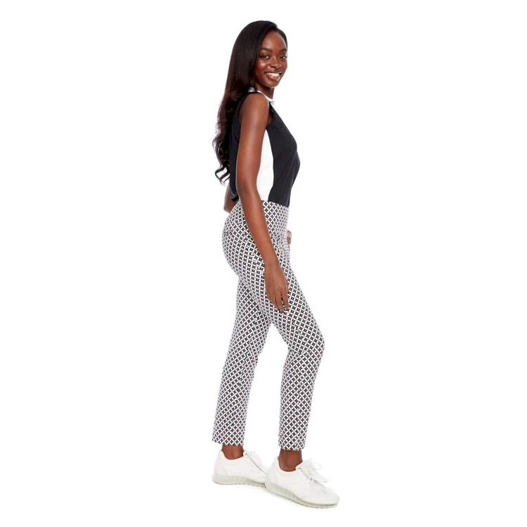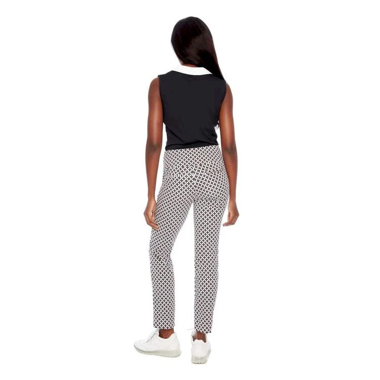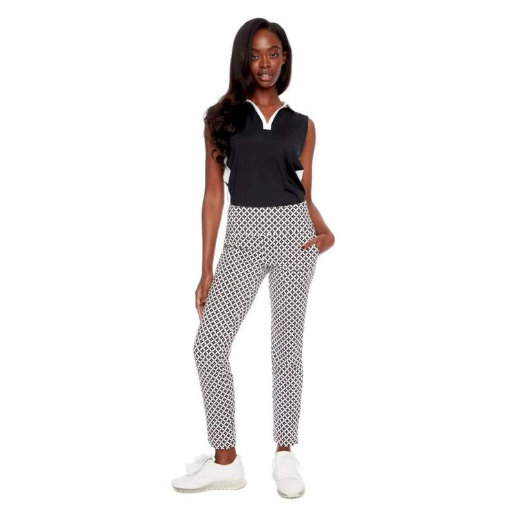 Affichez un look audacieux et raffiné sur le parcours avec le pantalon cheville Airspun Jetson de Swing Control. Son motif géométrique inspiré du style rétro, dans une palette éclatante de blanc, noir et corail, attire le regard avec chic. Conçu pour le golf mais pensé pour le confort, ce pantalon offre une coupe mince flatteuse, une taille élastique avec contrôle du ventre intégré, et un tissu performant qui épouse les mouvements. Idéal pour les golfeuses qui recherchent style, fonctionnalité et aisance.