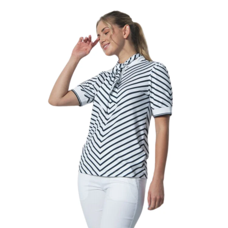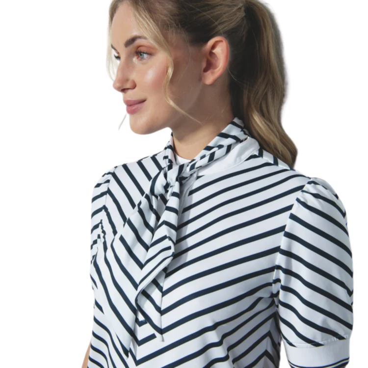 le Chandail manche 3/4 Seoul de Daily Sports, une pièce essentielle pour toute femme à la recherche d’un style rétro avec une touche moderne. Ce chandail, doté de manches 3/4, vous permet de créer un petit look rétro grâce à sa bande à nouer autour du cou. Avec ses lignes rayées marine et blanc, il ajoute une touche de sophistication à votre tenue, que ce soit sur le parcours de golf ou lors de vos sorties quotidiennes.