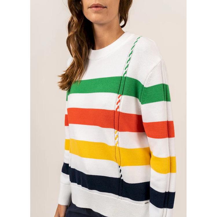 Le chandail Montagnac de Saint-James est un pull en jersey avec une maille fantaisie qui offre une texture douce et confortable à porter. Fabriqué à 100% en coton, ce chandail est parfait pour les journées fraîches, offrant une chaleur agréable sans compromettre le style. Les manches longues et le col rond ajoutent une touche de sophistication à ce chandail décontracté, tandis que les rayures multicolores apportent une touche de couleur vive. L’épaule tombante ajoute une touche de décontraction et de confort, tandis que le bord côte au niveau du col, des bas de manches et du bas de vêtement assurent un ajustement parfait et un style élégant. Populaire auprès des amateurs de mode, nous gageons que ce chandail s’envolera rapidement! Les larges rayures multicolores rappellent l’iconique amalgame de couleur d’une grande chaine de magasins, (devinez laquelle ??!!) ajoutant une touche tendance à ce chandail classique. Le chandail Montagnac de Saint-James est un choix parfait pour les personnes à la recherche d’un pull confortable et élégant pour toutes les occasions.