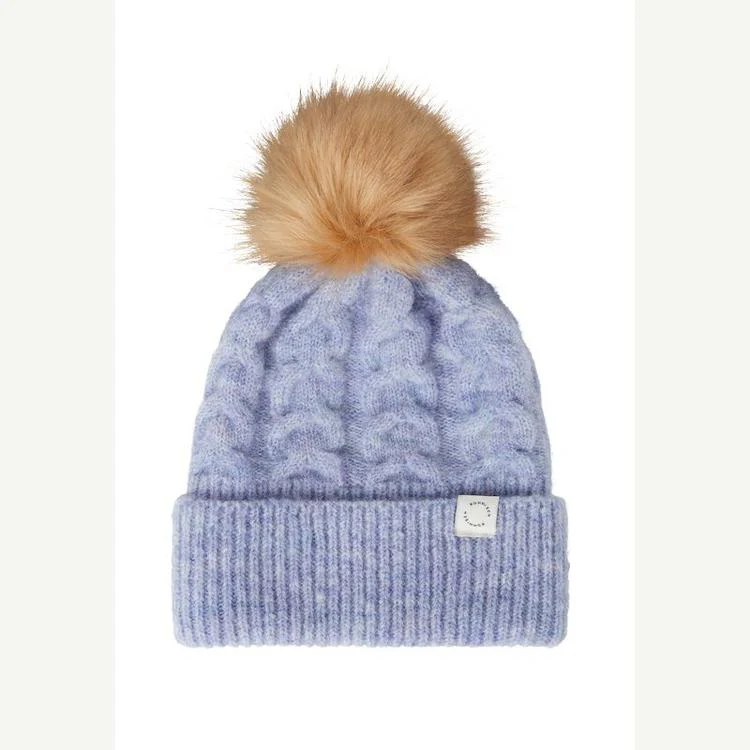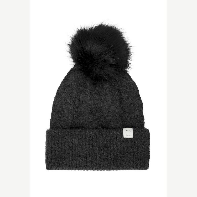 Bonnet chaud 62% en polyester recyclé et en laine sans museling, avec une boule en fausse fourrure sur le dessus et des détails en tricot câblé tressé.